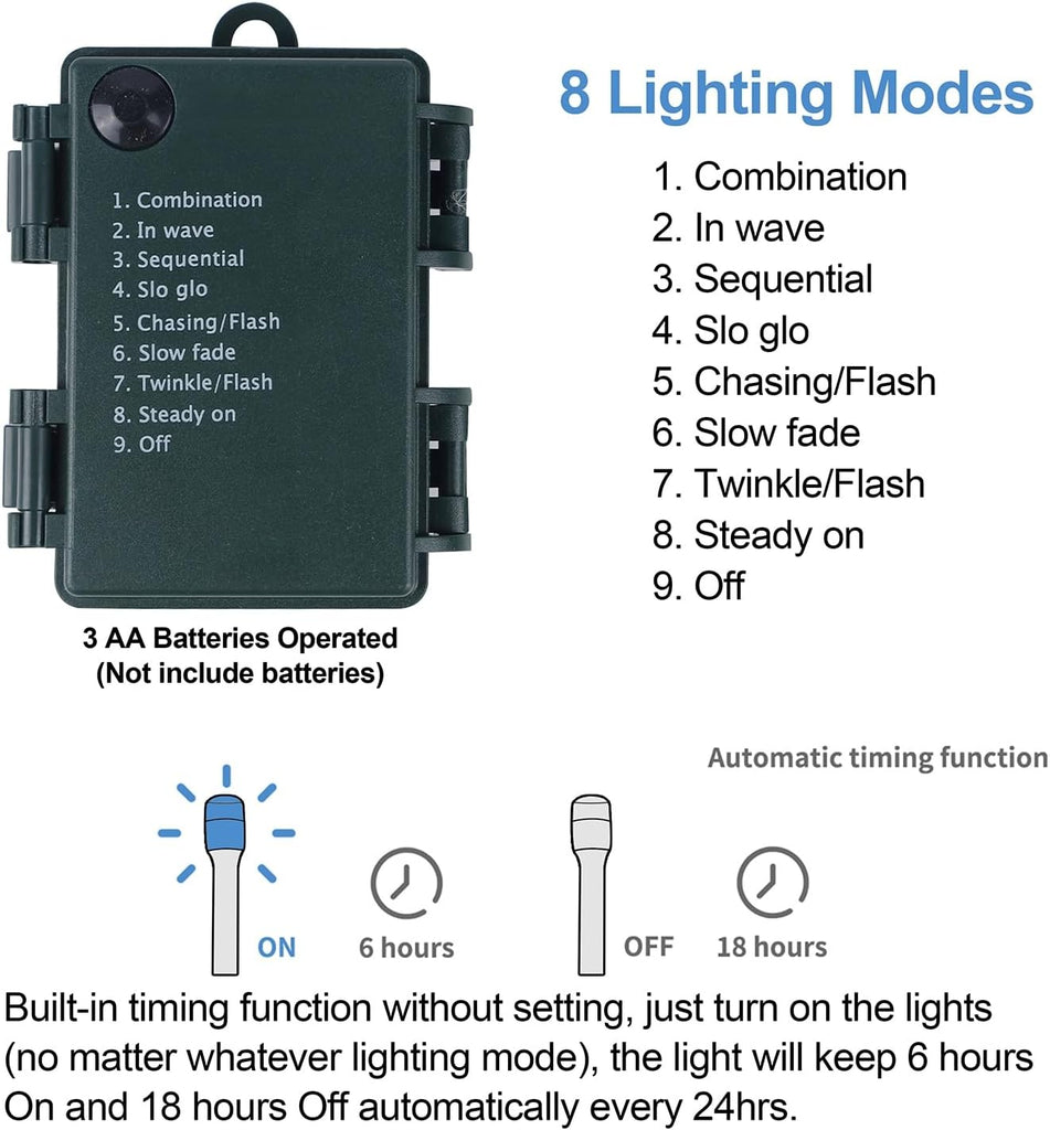 Choose from 8 festive lighting modes (steady, twinkle, wave, flash & more). The automatic timer keeps lights on for 6 hours and off for 18 hours, saving energy effortlessly.